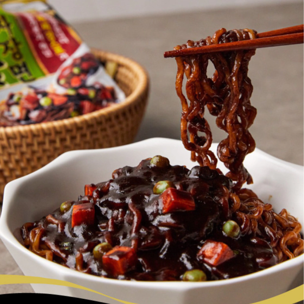 Delicioso platillo tradicional coreano Jajangmyeon: fideos secos bañados en salsa de frijoles negros con verduras. Incluye salsa premium en sobre retort para una preparación rápida y fácil en minutos.